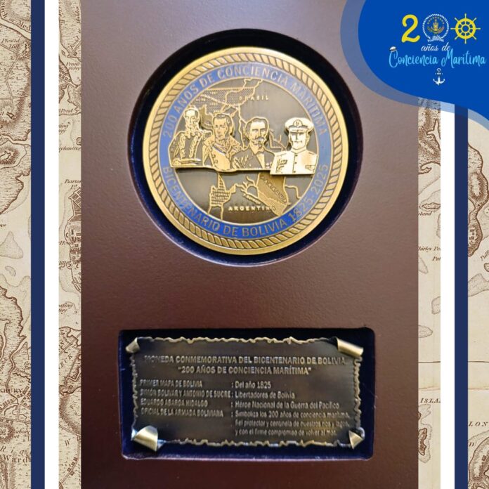 “Con profunda solemnidad y sentido de patria, la Armada Boliviana se honra en presentar, desde la histórica ciudad de Sucre, la Moneda Conmemorativa del Bicentenario de Bolivia por los ‘200 Años de Conciencia Marítima’, como un símbolo institucional de gran trascendencia que enaltece nuestra memoria colectiva y proyecta con esperanza el destino de la nación. Esta moneda no es solo una pieza conmemorativa; es un llamado a la conciencia nacional, una afirmación de que el mar vive en la memoria de cada boliviano. Representa 200 años de historia marítima, fluvial y lacustre, y proyecta la misión permanente de la Armada Boliviana de custodiar nuestros recursos hídricos y mantener viva la esperanza del reencuentro con el mar. A través de este símbolo, la Armada Boliviana expresa su lealtad inquebrantable a la Patria y su compromiso con un futuro de unidad, dignidad y soberanía”.