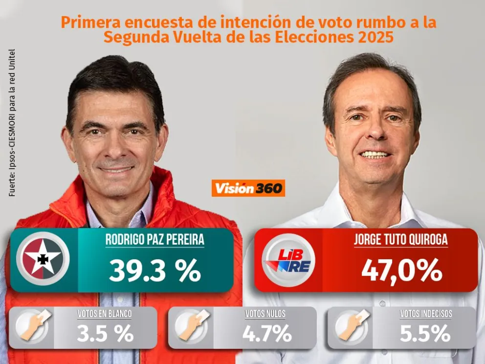 La primera encuesta de Ipsos-Ciesmori para la segunda vuelta presidencial del 19 de octubre revela un escenario de ventaja inicial para Jorge Tuto Quiroga, quien alcanza el 47% de intención de voto frente al 39,3% de Rodrigo Paz. Aunque la diferencia se amplía al considerar solo los votos válidos, el panorama está lejos de ser definitivo. El peso de los indecisos, los votos nulos y blancos, así como el electorado que aún no se identifica con ninguno de los candidatos, representa más de un tercio del total, lo que convierte esta elección en una contienda abierta y altamente dinámica.