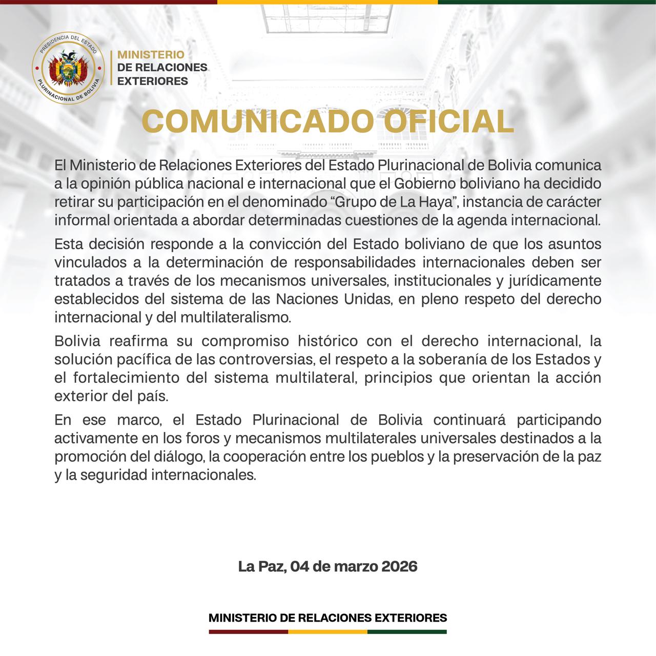 Bolivia decidió retirarse del denominado “Grupo de la Haya”, una organización integrada por países que impulsan acciones en defensa de Palestina en el ámbito internacional. La determinación fue comunicada a través de una nota oficial difundida por la embajada boliviana en Países Bajos y respaldada por un pronunciamiento del Ministerio de Relaciones Exteriores.