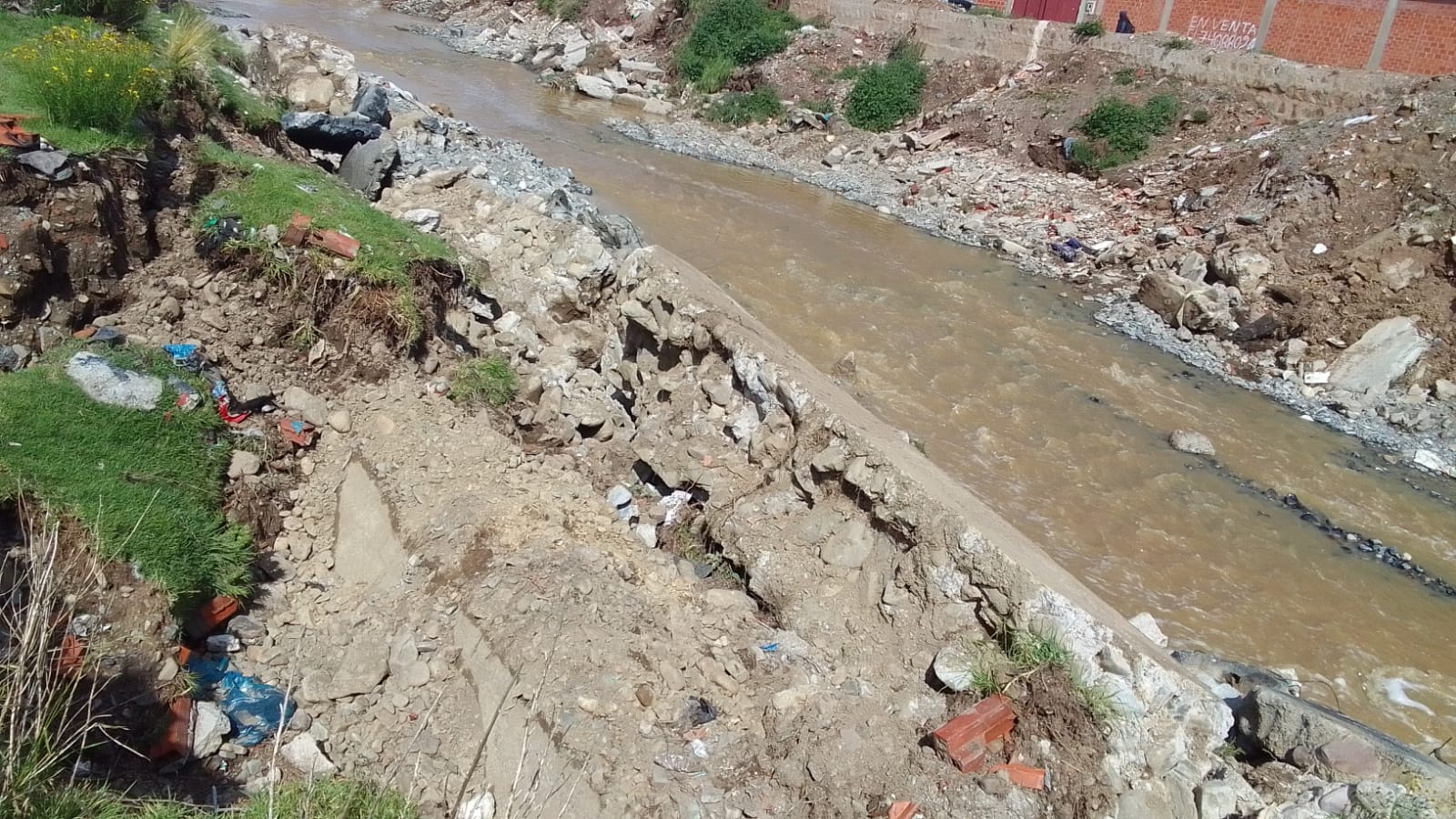 Un tramo de 30 metros del muro de contención del Río Seco, en el sector Mercedario del Distrito 4, colapsó el lunes debido a la crecida del afluente y la acumulación de escombros arrojados por vecinos.