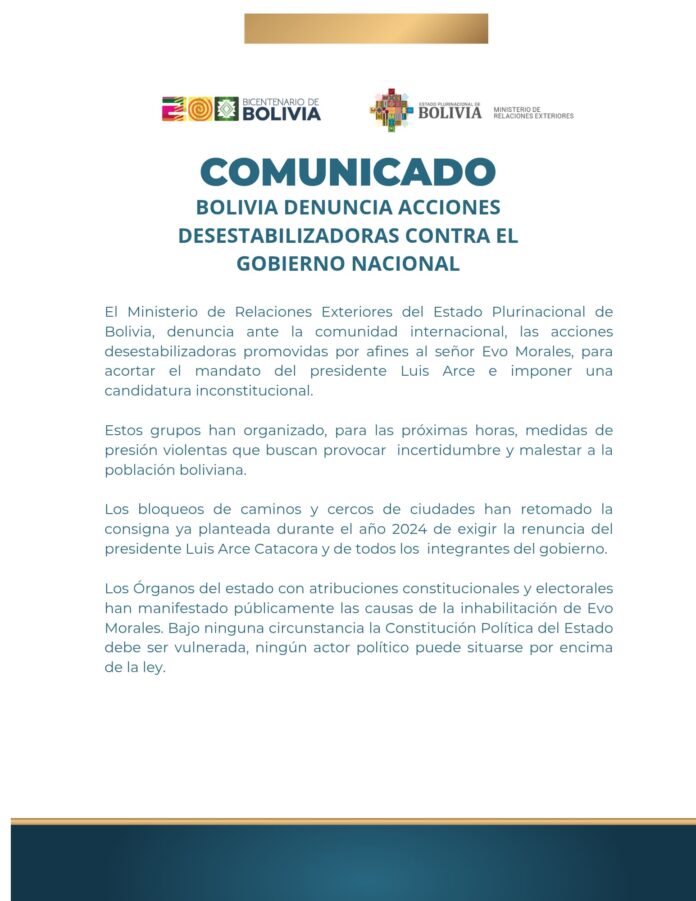 El Ministerio de Relaciones Exteriores denunció ante la comunidad internacional acciones desestabilizadoras promovidas por afines al expresidente Evo Morales. Estas medidas buscan acortar el mandato del presidente Luis Arce e imponer una candidatura inconstitucional.