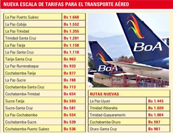 El ajuste se produce en un contexto en que la Boliviana de Aviación (BoA) es la principal aerolínea que opera vuelos nacionales, y la oferta de vuelos ha sufrido variaciones en frecuencia y disponibilidad de asientos, especialmente en rutas fuera del eje central, lo que también incide en los precios efectivos al consumidor.