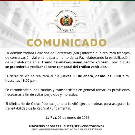 La Administradora Boliviana de Carreteras (ABC) confirmó que este jueves 8 de enero habrá un corte temporal de tránsito vehicular en el tramo Caranavi‑Guanay, en el norte del departamento de La Paz, debido a trabajos de emergencia para estabilizar la plataforma asfáltica y garantizar la seguridad de los usuarios.