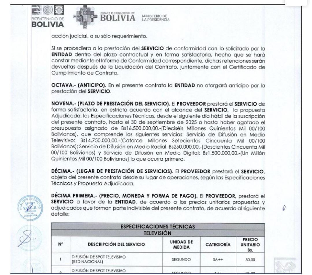 Está red televisiva, en 2023, se adjudicó cuatro convenios por un monto de 29,4 millones, mientras que en 2024 suscribió tres contratos que alcanzó los Bs 34 millones, es decir por Bs 16.5 millones.