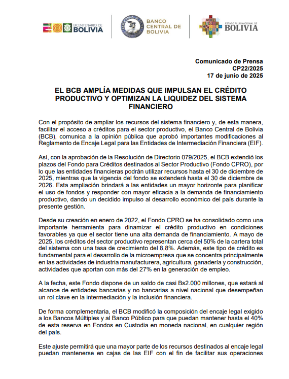 El Banco Central de Bolivia (BCB) aprobó la Resolución 079/2025, ampliando plazos del Fondo CPRO hasta 2026 y ajustando el reglamento de encaje legal. Estas acciones buscan dinamizar el crédito productivo y optimizar la liquidez del sistema financiero nacional.