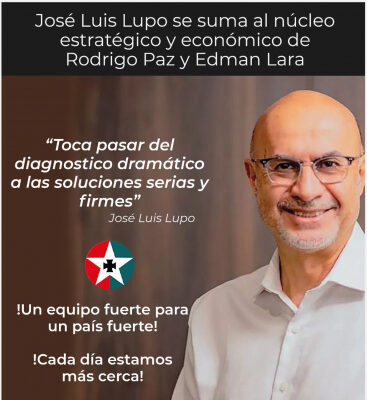 El excandidato a la vicepresidencia, José Luis Lupo, se incorporó al “núcleo estratégico y económico” de la campaña presidencial de Rodrigo Paz y Edmand Lara, sumándose al equipo técnico para fortalecer la propuesta de cara a las elecciones. Esta información fue difundida a través de un banner enviado por la campaña de Paz-Lara, que incluye una breve declaración de Lupo: “Toca pasar del diagnóstico dramático a las soluciones serias y firmes”.