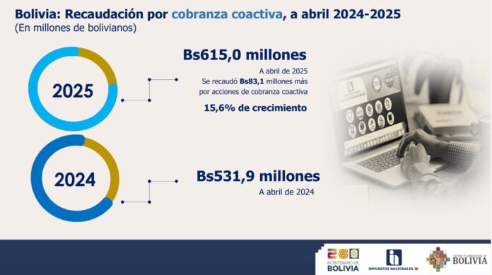 Es decir que en el primer cuatrimestre de 2024 el monto recaudado por cobranza coactiva llegó a Bs531,9 millones y a abril de 2025 creció a Bs615 millones., con el crecimiento porcentual positivo del 15,6% (Bs83,1 millones más).