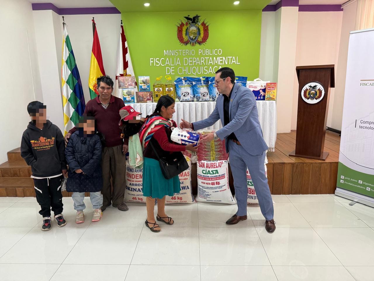 En un acto de solidaridad, el Fiscal Departamental de Chuquisaca, Mauricio Nava Morales, entregó víveres a la familia ampliada de tres niños que sufrieron un intento de infanticidio en un barrio periférico de Sucre el pasado 26 de junio. La madre de los menores les hizo ingerir órganos fosforados, poniendo en riesgo sus vidas.