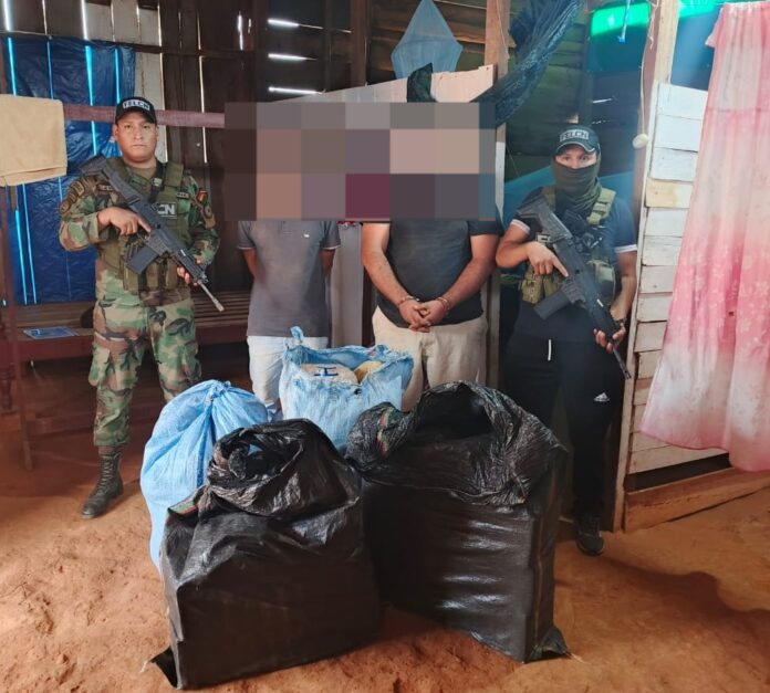El operativo, liderado por la Fuerza Especial de Lucha Contra el Narcotráfico (FELCN), encontró 330 paquetes tipo ladrillo en nueve bolsas. Durante el ingreso al inmueble, un tercer sospechoso logró huir hacia el monte.