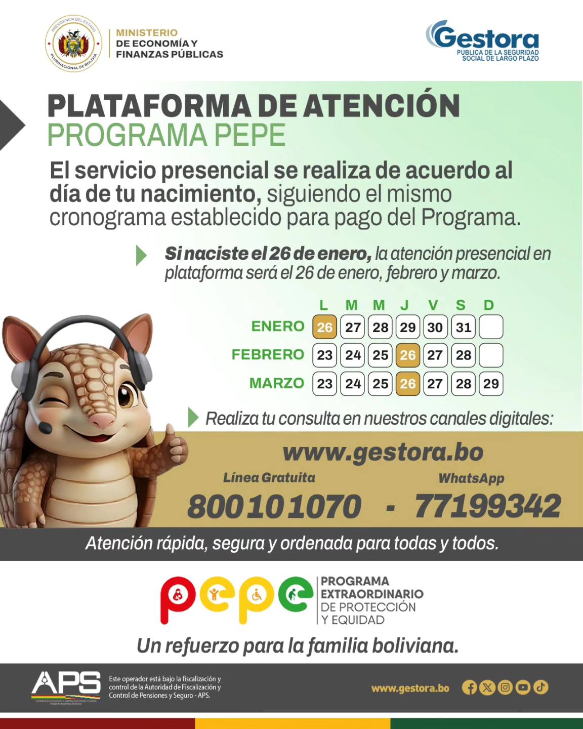 Los ciudadanos podrán comunicarse para verificar la fecha de pago según su fecha de nacimiento, consultar sobre la ubicación de los puntos de cobro y reportar problemas o inconsistencias en la entrega del bono. La autoridad recordó que este servicio está disponible para todas las regiones del país y que el personal de la Gestora atenderá de manera prioritaria a quienes presenten inconvenientes.