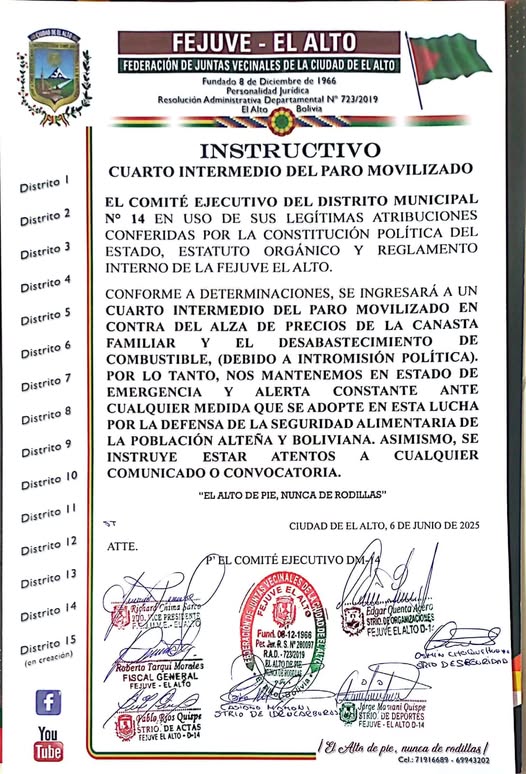 En el siguiente cominicado la Fejuve de El Alto suspendió temporalmente los bloqueos al identificar intromisión política.