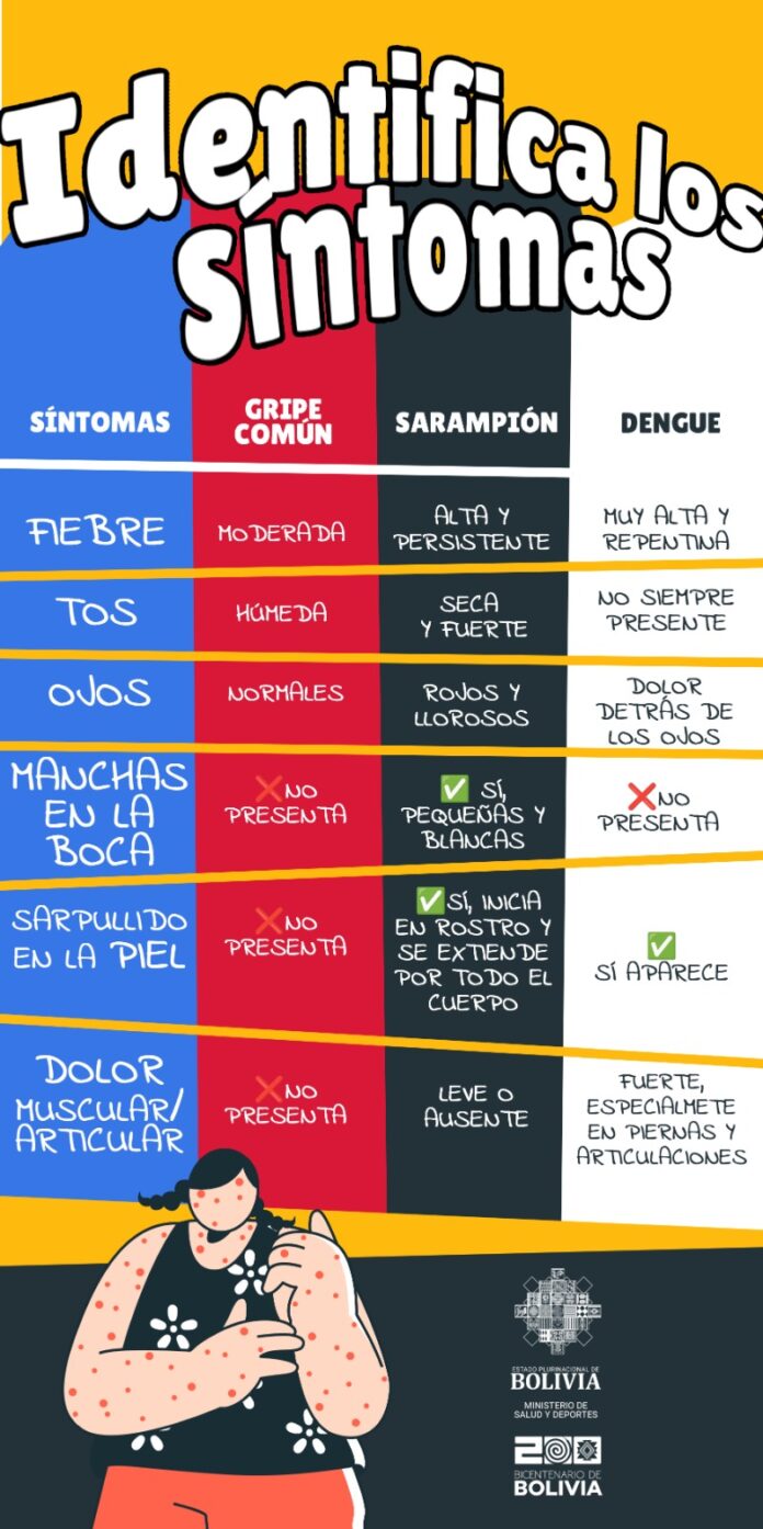 El Ministerio de Salud explicó las características que distinguen al sarampión de otras enfermedades como el resfrío, gripe, varicela y dengue. Según Roxana Salamanca, jefa de la Unidad de Prevención y Control de Enfermedades, el sarampión se identifica por conjuntivitis severa y fiebre alta, síntomas que progresan hasta manchas rojas que inician en la cara y se extienden al cuerpo.