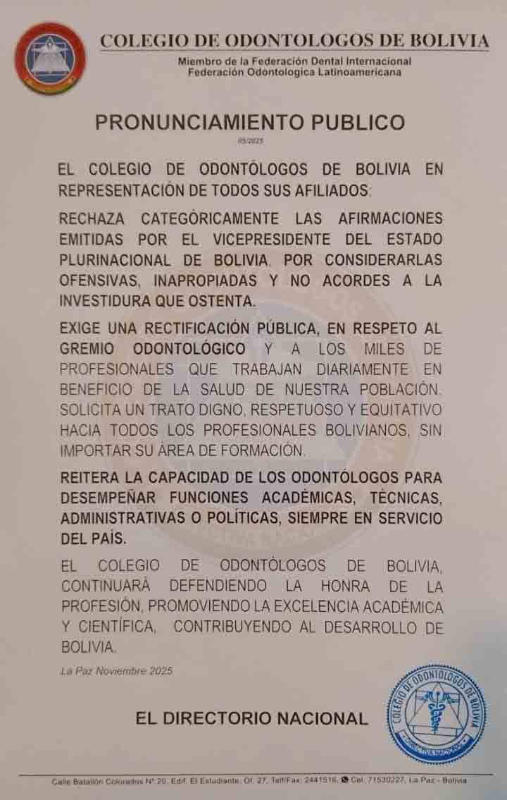El Colegio de Odontólogos de Bolivia expresó su rechazo a las afirmaciones realizadas por el vicepresidente Edmand Lara contra el viceministro de Deportes, Roberto Bustamante. En un comunicado público, la institución calificó las declaraciones como “ofensivas” e “inapropiadas”, señalando que ponen en duda la idoneidad de una autoridad designada para impulsar políticas deportivas en el país.