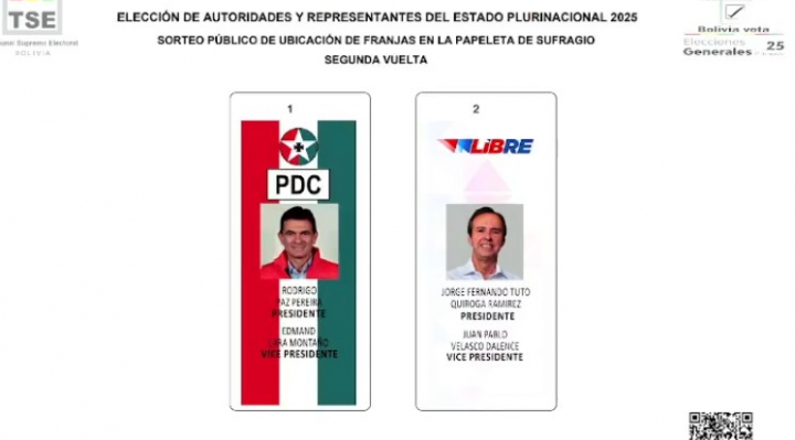 En una reunión de Sala Plena pública, el Tribunal Supremo Electoral (TSE) llevó a cabo el sorteo para definir la ubicación en la papeleta de los dos candidatos presidenciales habilitados para la segunda vuelta electoral; Rodrigo Paz del Partido Demócrata Cristiano (PDC) irá primero a la izquierda y Jorge Tuto Quiroga (Libre) irá segundo, a la derecha.